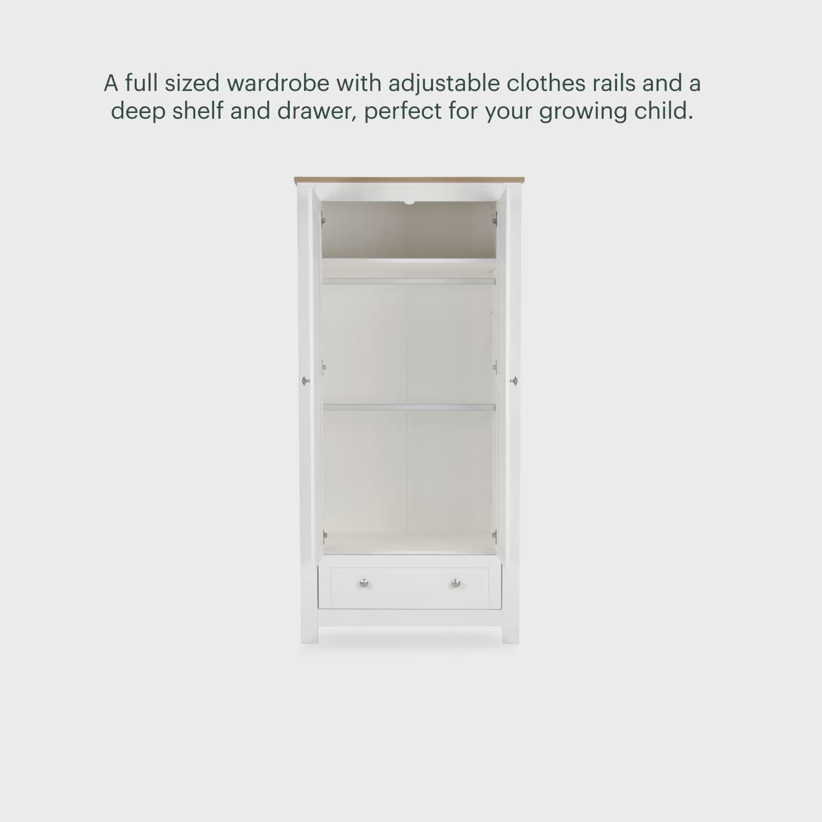 As tiny outfits become growing wardrobes, the Burford Wardrobe adapts effortlessly. Featuring two removable hanging rails and a deep internal shelf, it provides flexible storage from day one. The rails can be removed as your child grows, converting the interior into a full-height wardrobe suitable for larger clothing. With its warm oak-effect finish and classic detailing, it offers practical organisation wrapped in timeless design.