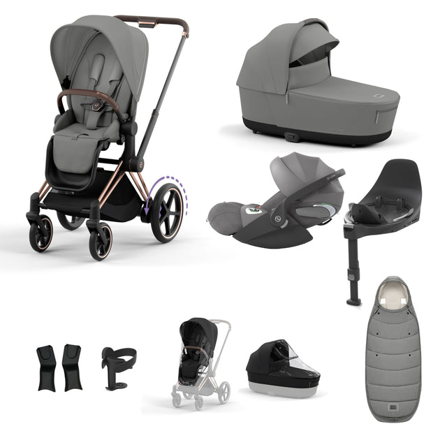 The Cybex ePriam Ultimate Travel System, Mirage Grey/Rose Gold brings together premium pushchair engineering with travel-system versatility, giving modern families everything they need from birth through toddlerhood in one sleek package.
