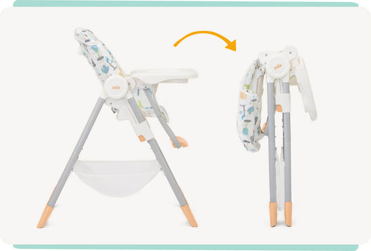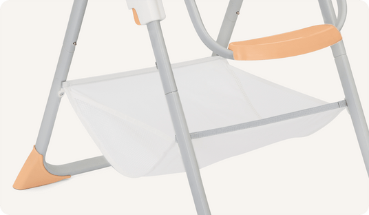 For added convenience, the one-hand, quick compact fold can be accessed easily from the middle of the seat, allowing for effortless storage. The highchair folds into an extremely compact and freestanding position, saving space when not in use. A removable, wipeable seat pad makes cleaning simple, while the large storage basket keeps essential items like wipes, utensils, and toys within easy reach.