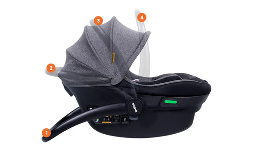 The JoviKids Aria Car Seat encourages bonding between parents and their baby with its practical three-position adjustable handle. This feature allows effortless access for feeding, comforting, or simply connecting while on the move, ensuring travel remains a nurturing and interactive experience.