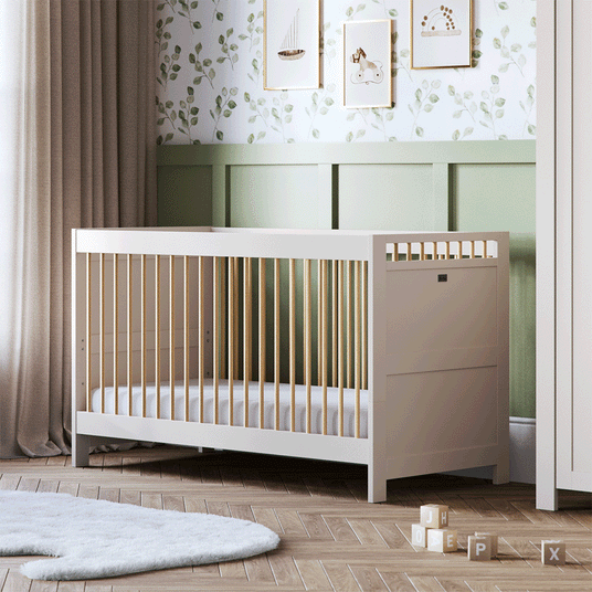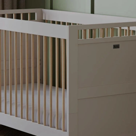 Crafted with clean, elegant lines and adorned in gender-neutral tones of soft cashmere with natural oak accents, the Seville Convertible Cot to Toddler Bed brings a fresh and calming ambience to any nursery space. Its timeless design complements various decor styles while maintaining a sense of sophistication.