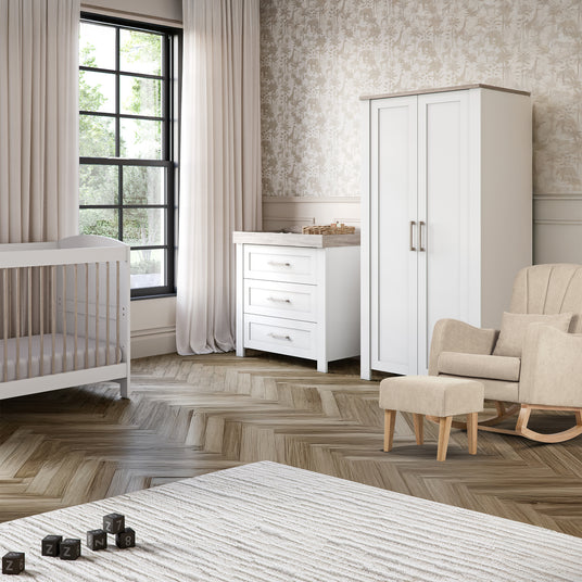 Thoughtfully designed to grow with your child from newborn to toddler, this elegant set features a fresh white finish paired with warm natural ash accents—offering a timeless, two-tone look that suits any nursery décor.