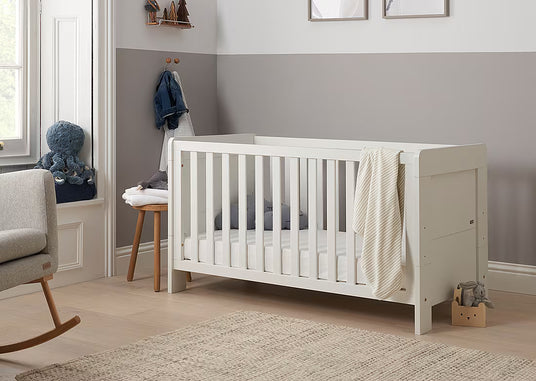 The soft white finish makes it a perfect fit for both contemporary and traditional interiors. With its clean lines and minimalist aesthetic, this cot bed complements a variety of nursery styles, from playful and colourful to neutral and understated.