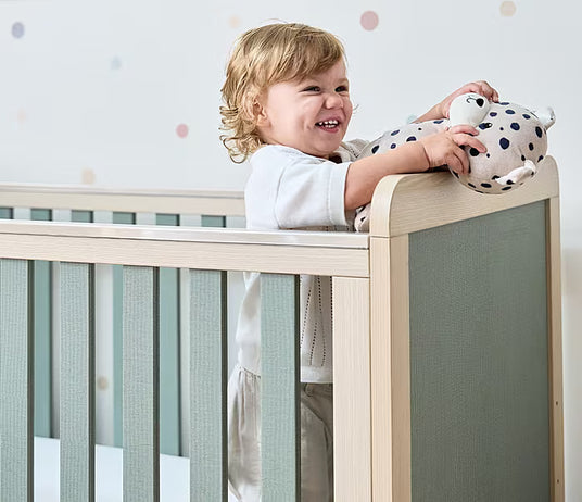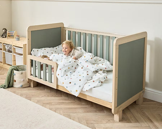Designed to grow with your child, the Kuba Cot Bed effortlessly transitions from a cosy cot to a junior bed, complete with a matching bed guard for added safety. This adaptable design ensures it remains a reliable and comfortable sleep solution from infancy through toddlerhood.