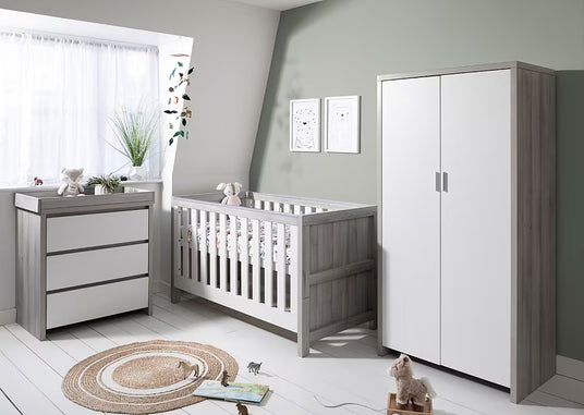 The Tutti Bambini Modena 3 Piece Nursery Furniture Set, White & Grey Wash combines modern design with practicality, offering a cot bed, chest of drawers with a changer, and a spacious wardrobe. Featuring sleek lines, non-toxic finishes, and ample storage, this set grows with your child, providing a stylish and functional nursery solution from birth to early childhood.