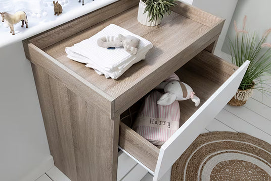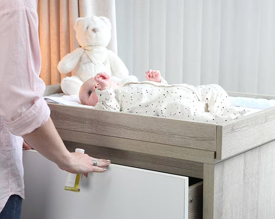 Designed with practicality in mind, the Modena Chest Changer includes a removable changing top that sits securely in place, creating a safe and convenient space for nappy changes. The spacious surface accommodates most standard-sized changing mats, providing plenty of room to keep baby comfortable during changing time. Once the nappy-changing phase is over, the top can be removed, leaving behind a stylish chest of drawers that continues to provide valuable storage for years to come.