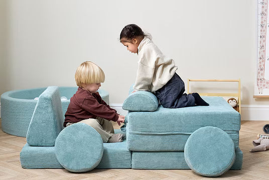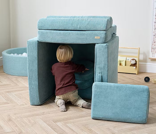 Designed with versatility in mind, this innovative piece of furniture easily transforms to suit your child’s needs, whether it’s a cosy lounge for relaxing, an adventurous fort for playtime, or even a practical sleepover bed. Its soft sea mist colour, paired with a high-quality jumbo corduroy fabric, blends beautifully into any home or playroom décor while adding a touch of elegance and fun.