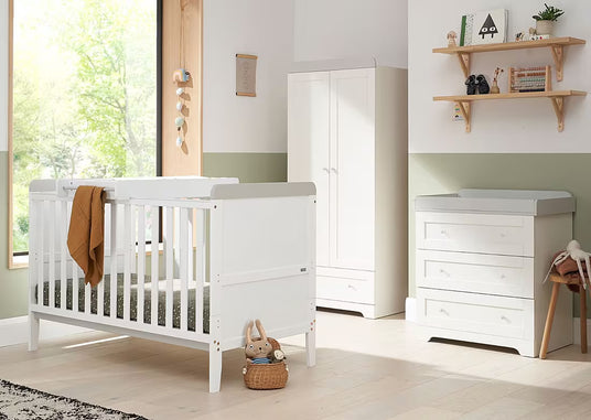 The Tutti Bambini Rio Nursery Furniture Set, White / Dove Grey is a thoughtfully designed collection that combines modern style with practicality, making it the perfect choice for your baby's room. Featuring a cot bed, chest of drawers with a changing top, and a spacious wardrobe, this set offers everything you need to create a functional and elegant nursery. The neutral colour palette complements a variety of decor styles, while the sturdy construction ensures lasting quality as your child grows. With ample storage options and versatile features, the Rio room set is designed to adapt to your family's needs, providing a safe, organised, and stylish space for years to come.