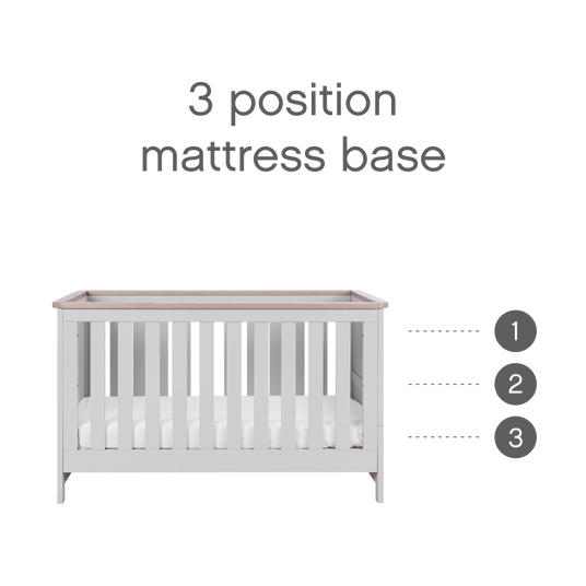 - Adjustable mattress heights: Three mattress positions to suit newborns, babies, and toddlers.